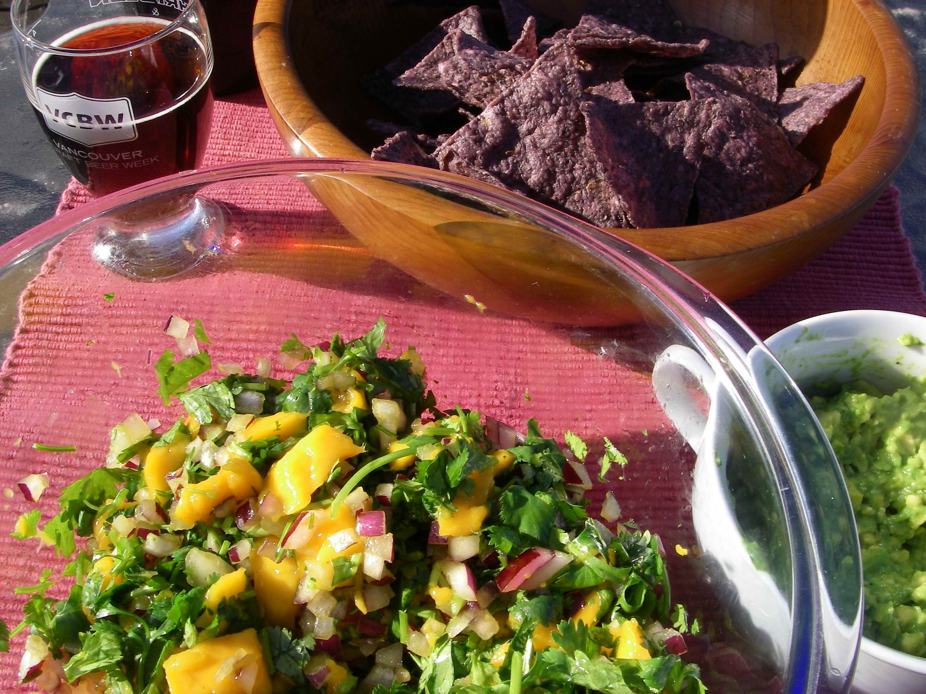 I adore homemade fruit salsas and have found that putting tomatoes in is not necessary at all. Experiment with different fruits and be creative. You might discover an amazing new flavour combination! I have made tomato salsa, mango salsa and peach salsa. The sweet fruits are my favourite, as their sweetness combines with the zing of the onions and the aromatics of the cilantro in a wonderful way. Mexican mangoes are available early in our summer season, but when the Okanagan peaches are in season whip up some refreshing peach salsa and get out in the sun asap.